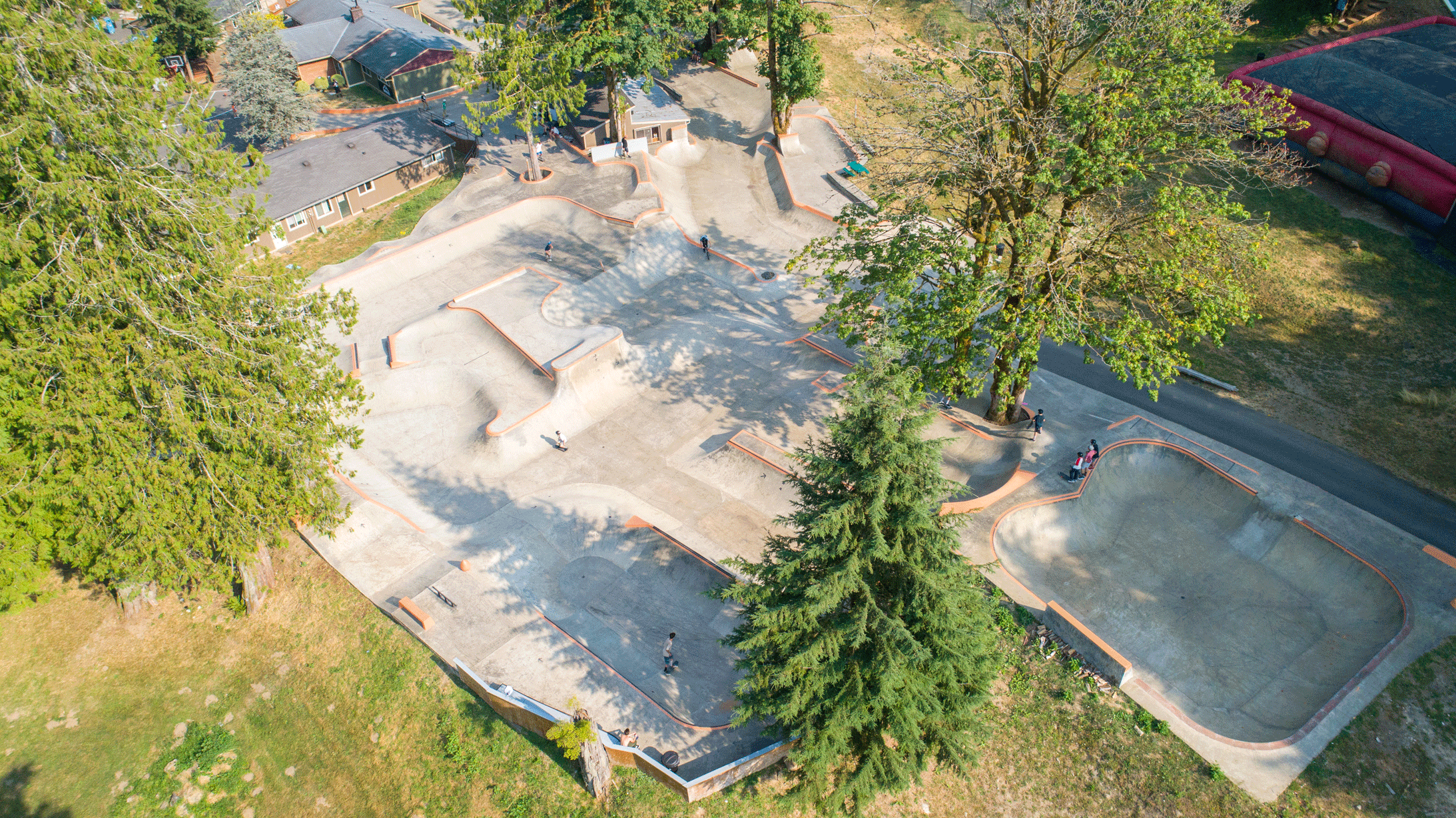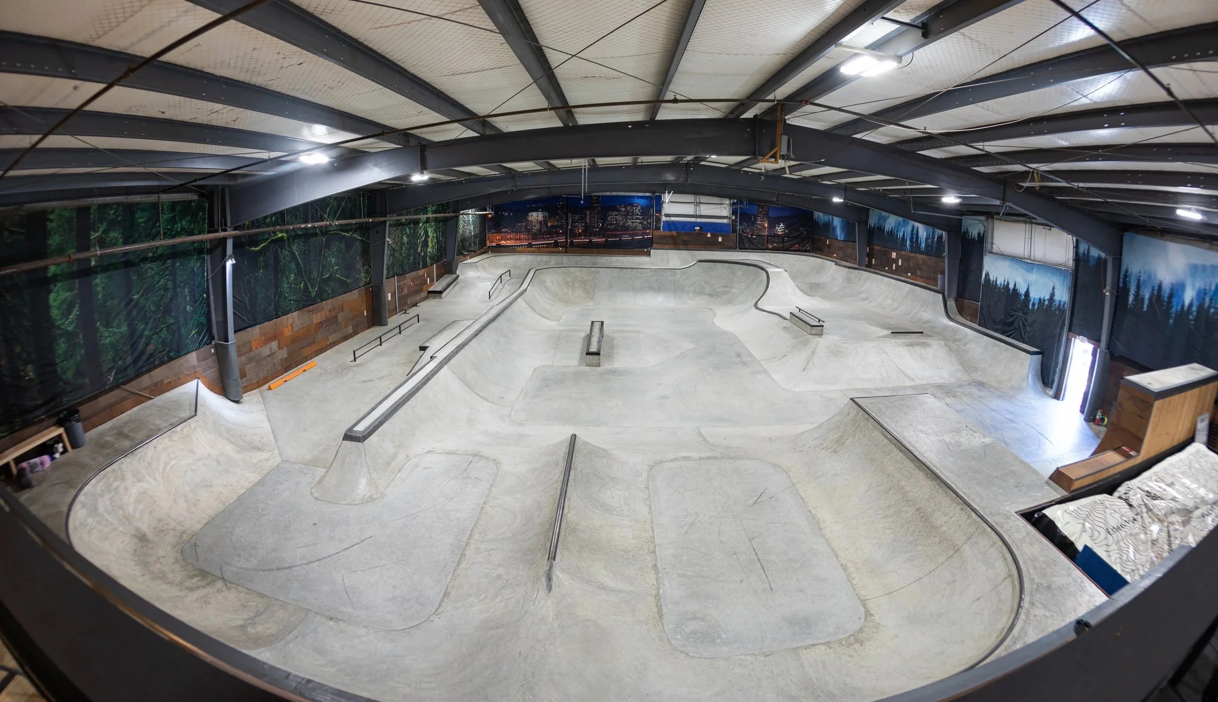 Our Concrete Jungle skateboard and bike park stretches throughout the entire campus with over 50,000 square feet of rideable terrain, featuring a miniramp section, concrete bowl, quarterpipes, spines, banks, hips, a vert wall with pool coping, rollers, ledges, rails, steps, manual pads, and so much more for you to find endless lines.