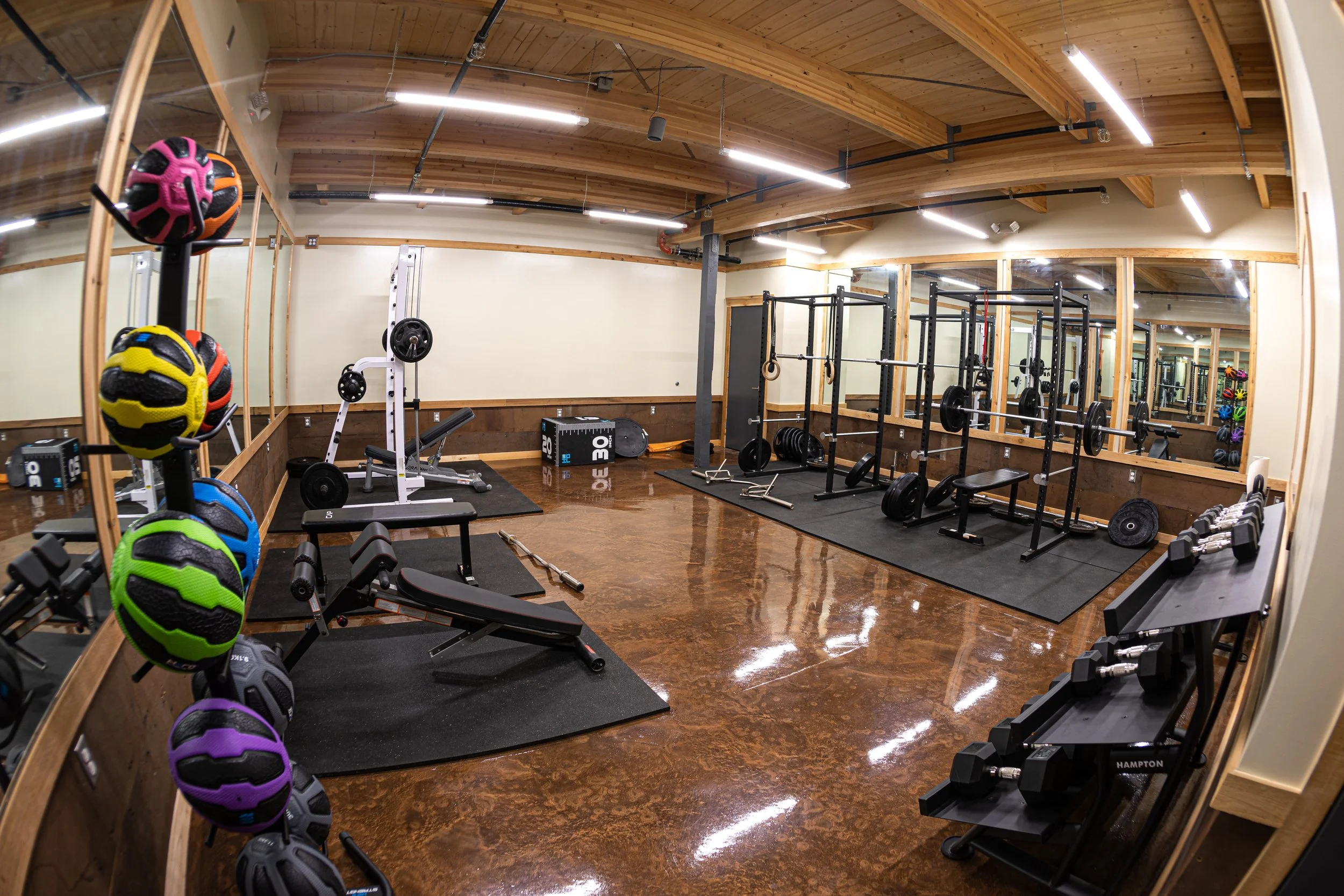 Stretch, plyometri, tumbling, spin bike zone